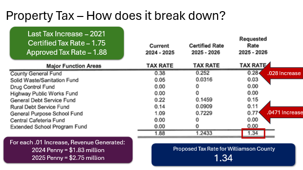 Please note that the proposed tax rate increase—from 1.2433 (Certified Rate) to 1.34 (Requested Rate)—as well as the proposed budget, are still under review and have not yet been finalized.